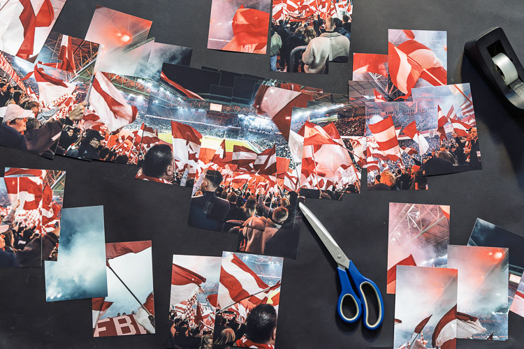 Puzzlearbeit beim Zusammensetzen des Stadionpanoramas vom Spiel Fortuna Düsseldorf – Arminia Bielefeld.